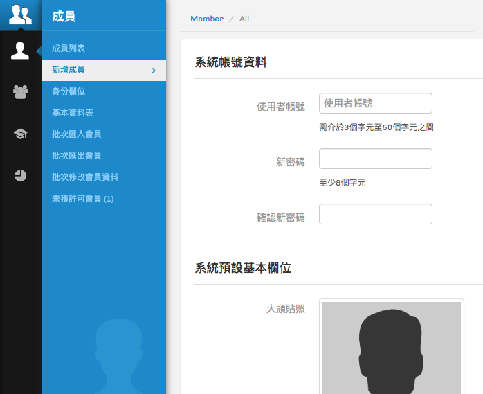 系統管理員可以點擊左側「成員」選單中的「新增成員」,新增一筆會員資料。
