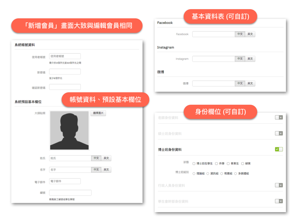 新增會員頁面共分為系統帳號資料、系統預設基本欄位、基本資料表與身份欄位四大區塊。